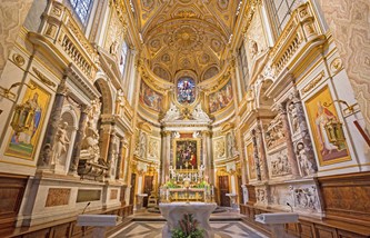 Frescoes fill the ceilings designed by Giuliano da Sangallo and originated from the 16th century. On the triumphal arch, a mosaic portrays the story of Jesus’ birth, the annunciation of Angel Gabriel to Mary, the infanticide by order of King Herod, and the calling of the apostles. At the leftmost door, you will find the Porta Santa (Holy Door). This is only opened during the Holy Year.